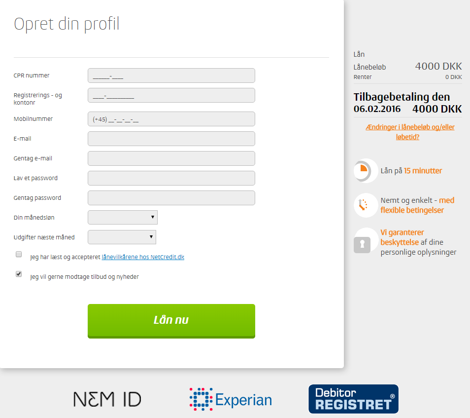 Scanbanker kan med ro i sindet anbefale Netcredit næste gang du har brug for et hurtigt og gratis lån uden sikkerhed eller dokumentationskrav. Du får udbetalt pengene i en fart og det hel forgår efter bogen. Deres ansøgnings-formularer er enkelte og hurtige at forstå og udfylde. Der er yderligere god mulighed for support både pr mail og telefon hvis du skulle have nogen spørgsmål. Alle betingelser og vilkår er lige som man forventer og de er ydermere godkendt af Finanstilsynet.